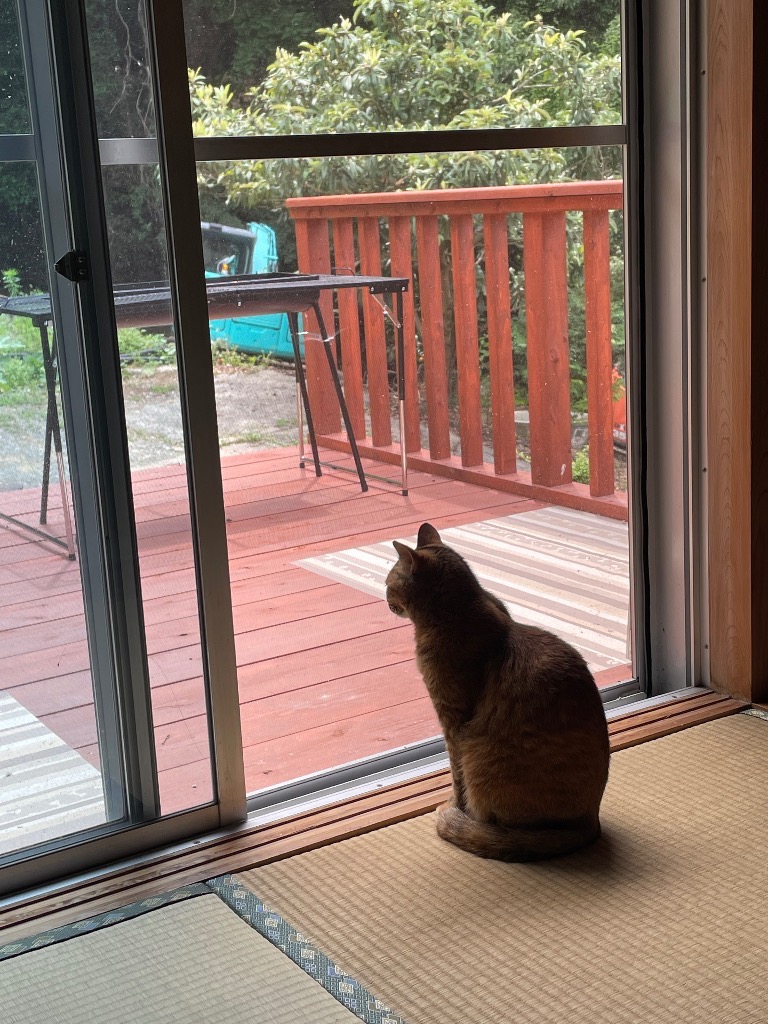 工房の軒下には15世帯の燕の家族の巣があります。工房周りに凄い数の燕のカップルが飛んでます。ひっきりなしに雛に餌を運んでます。 紀の川市に来て自然を堪能し、ゆっくりとした時間を過ごし、暇だなーと呟いてます。 店長も窓から眺めてます。