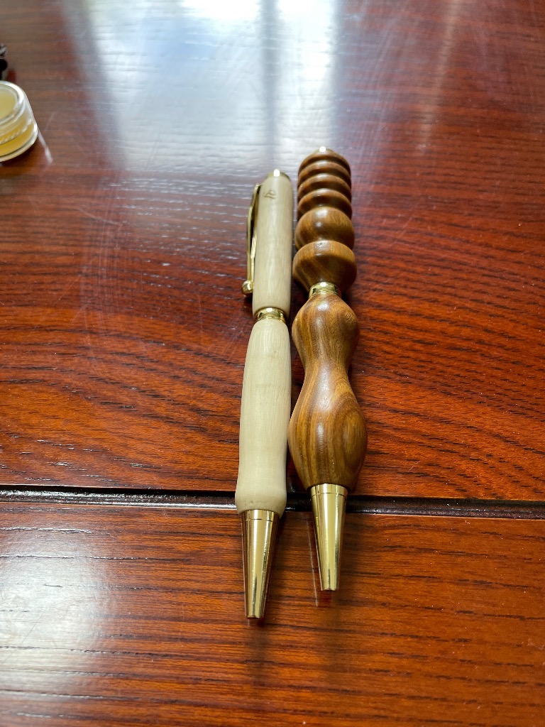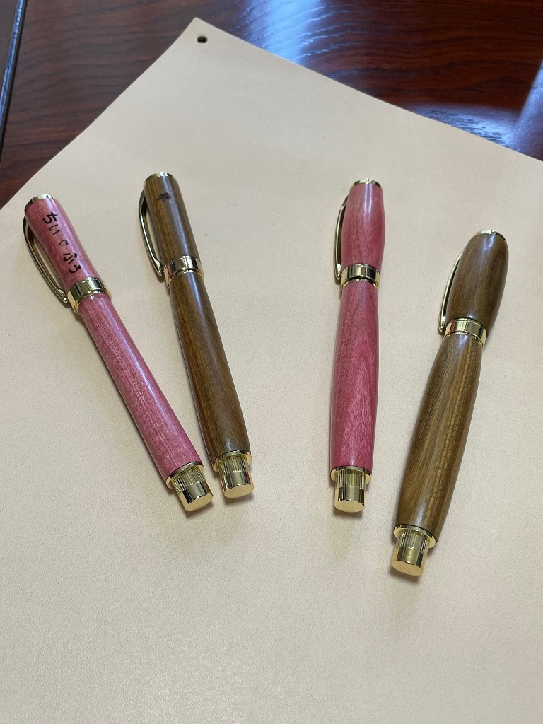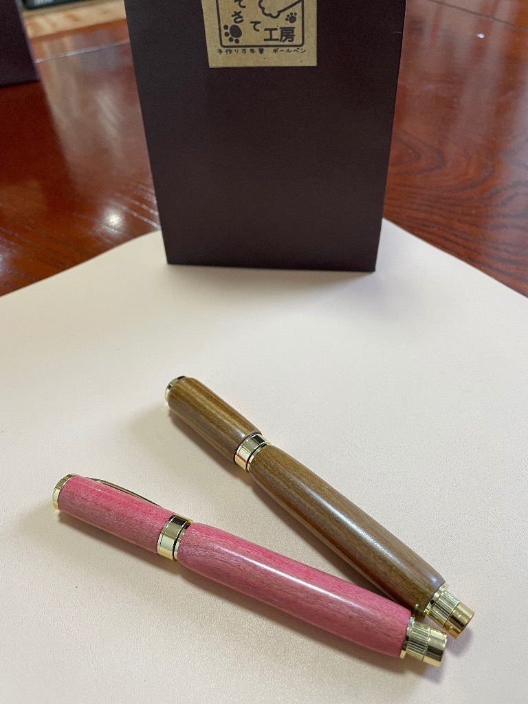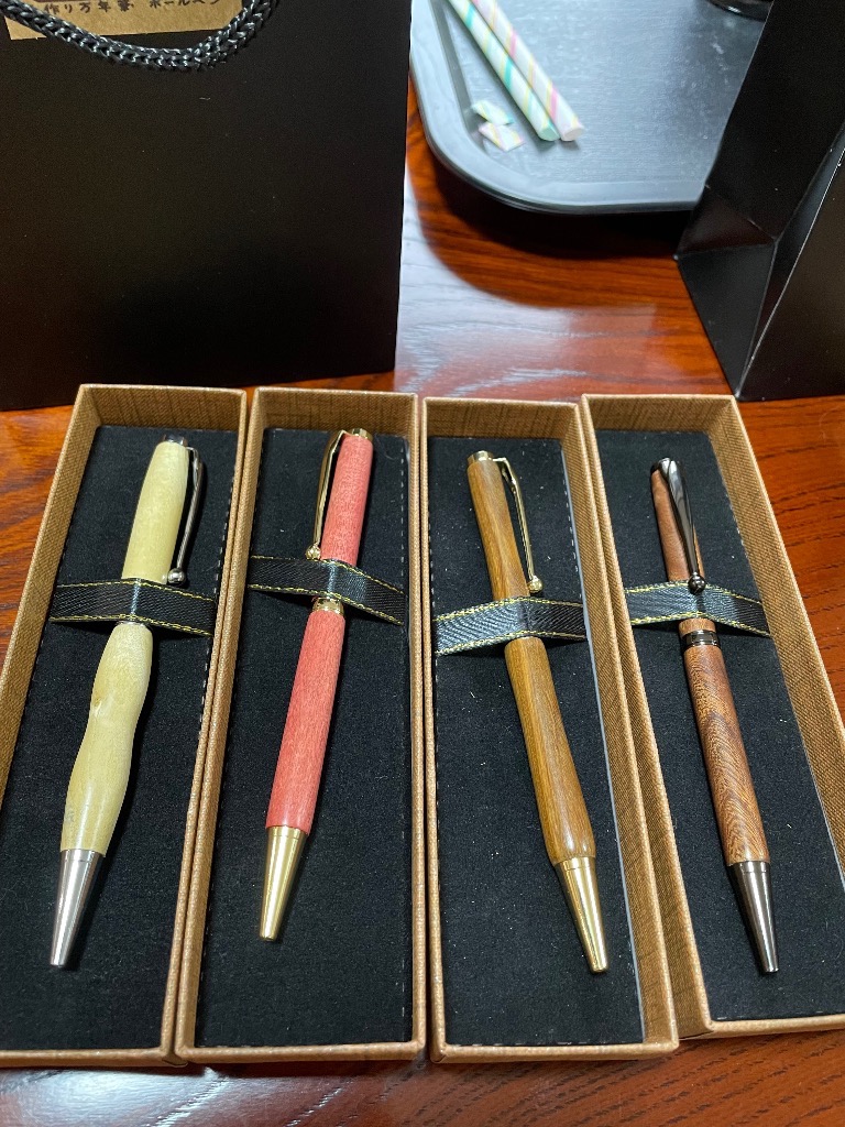 今日のボールペン体験工房のお客様は同市の紀の川市からのご家族さんでした。娘さんとお母さんの合作は金木犀の木でお父さんはパロサント(緑檀)を選ばれ作ってもらいました。2本共綺麗な仕上がりでしたが、お父さんの作ったデザインは想像外工芸作品でした。