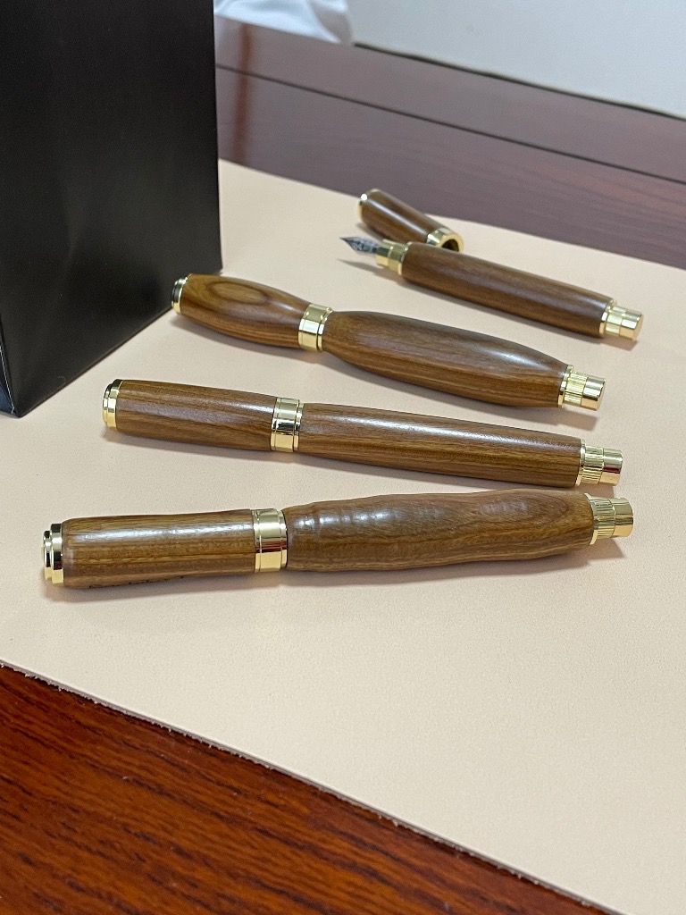 今日の体験工房は総勢13名来て来てくれました。2部に分かれて8本万年筆でした。リグナムバイタ6本。 ピンクアイボリー2本でした。ご家族で作ったり楽しそうで何よりです。 後半で作った万年筆はまた写真撮るの忘れました。前半の4本は撮りました。今日も良い作品が出来良かったです。レーザーネーム入れて、蜜蝋ワックス、ペンケース付きです。