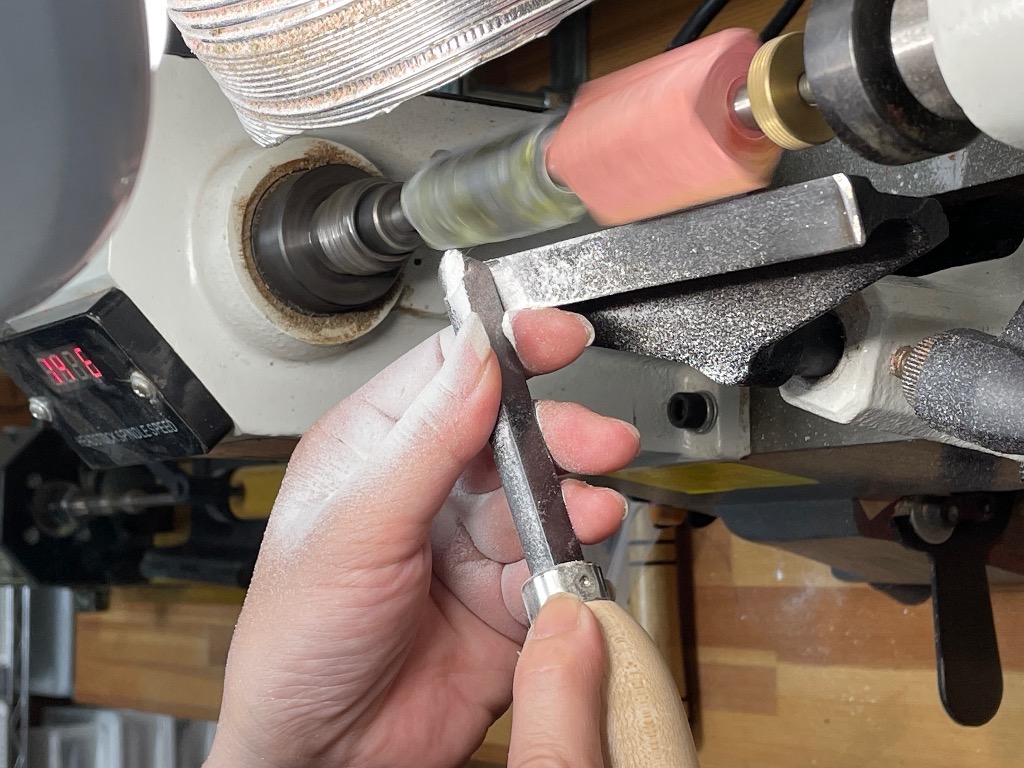 良く来て頂く方が、今回も持ち込みでボールペンを作りに来てくれました。 今回は何と石でした。手に粉が積もってました。