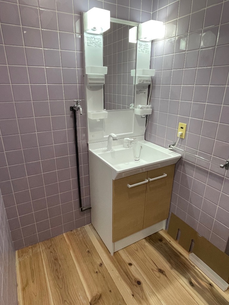 今日も紀の川市の工房はプチリフォームしました。洗面所の朽ちた洗面台を撤去して、カフェ板を貼って、新しい洗面台を設置しました。