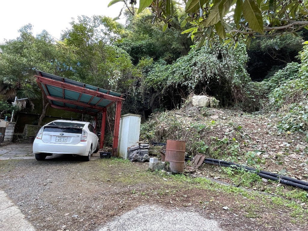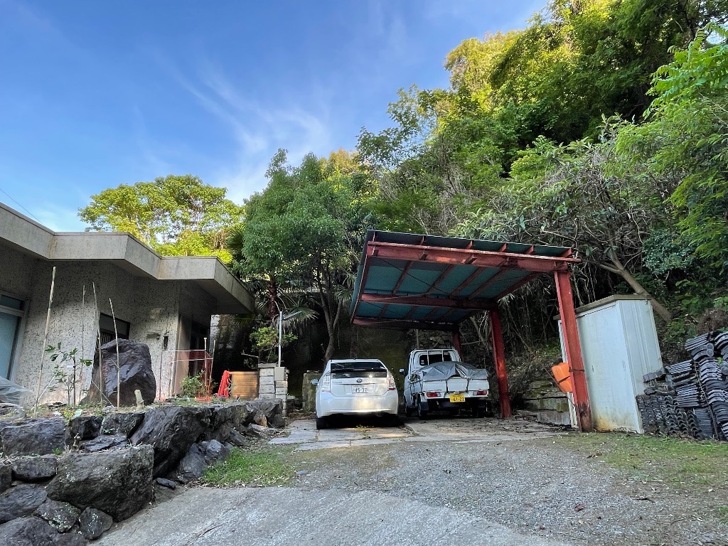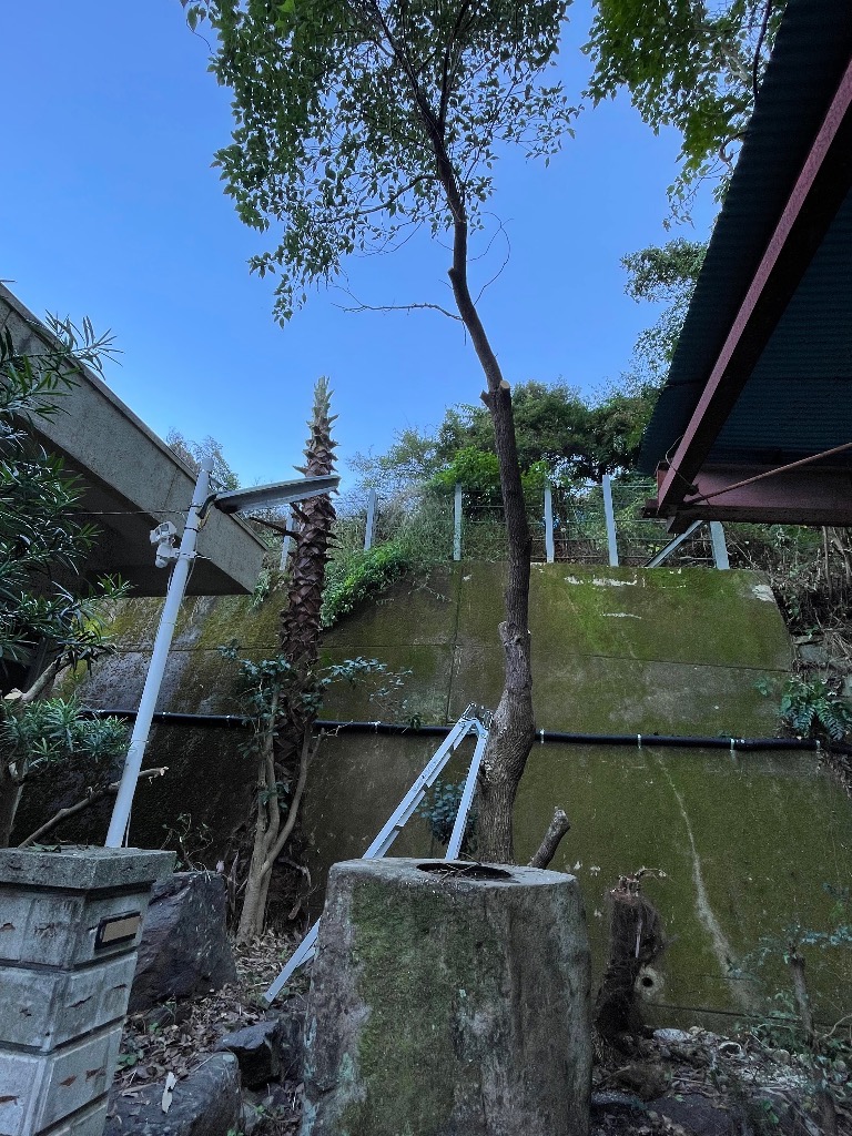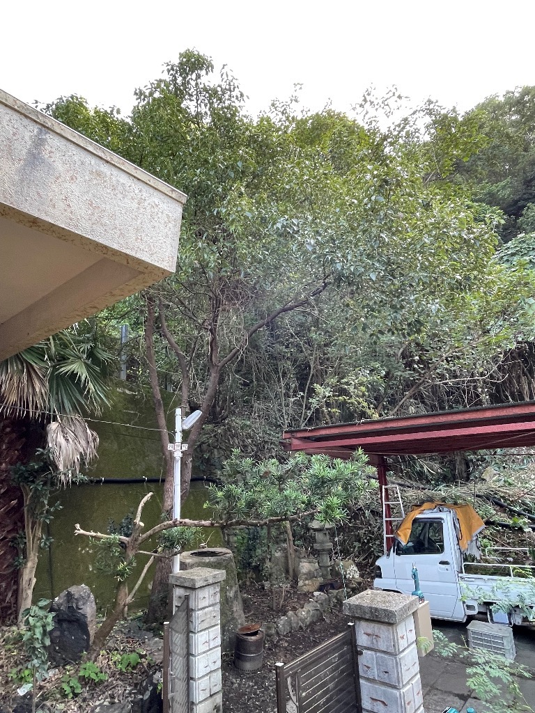 工房の裏山の木がカーポートまで覆ってました。 何度か伐採を試みましたが、斜面の為、諦めてました。が!なんと和歌山県が重機を山に入れる通り道を作りたいとの事で快諾しました。
