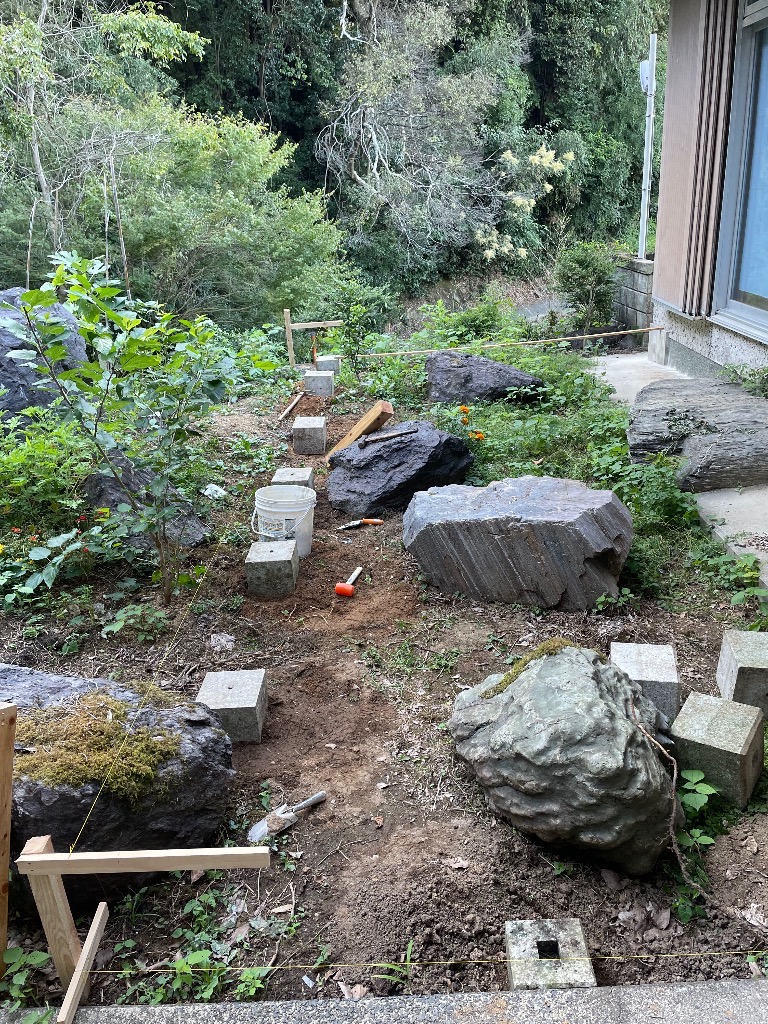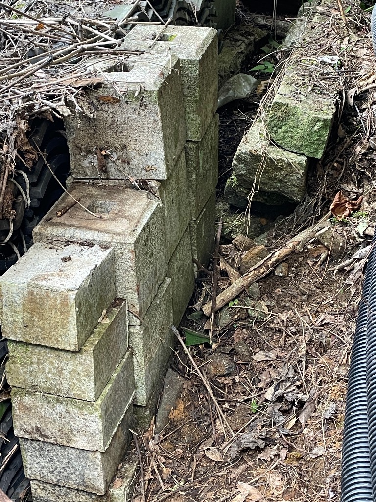 裏庭に捨ててあった束石を運んで、基礎に並べてみた。気の遠くなる作業。