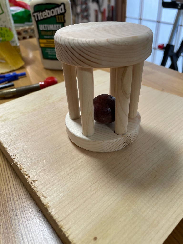 同じ紀の川市の方にお孫さんが出来たとの事で、赤ちゃん用のおもちゃを作りに来てくれました。ヒノキで丸にカットしたり、パープルハート材で球を旋盤で作ったり全て、ご自分で製作、設計しました。 優しいお爺ちゃんでした。
