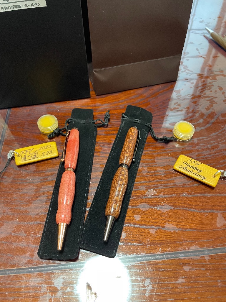 結婚5周年記念旅行の帰りに「さてさて工房」を見つけられボールペンを作ってくれました。ほのぼのカップルさんでいつまでもお幸せに!