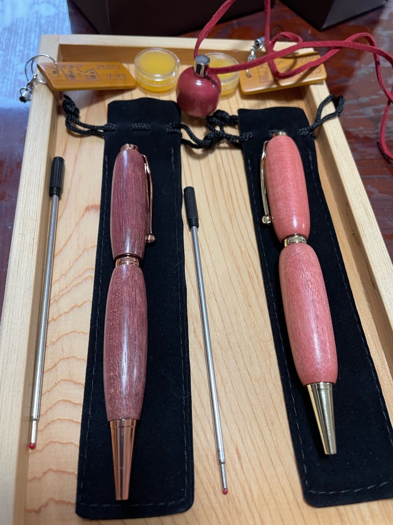 今日は紀の川市で開催中のプル博からのお客様でした。お母さんと娘さんのご家族で、ピンクアイボリーとパープルハートのボールペンとピンクアイボリーのアロマペンダントを作ってくれました。