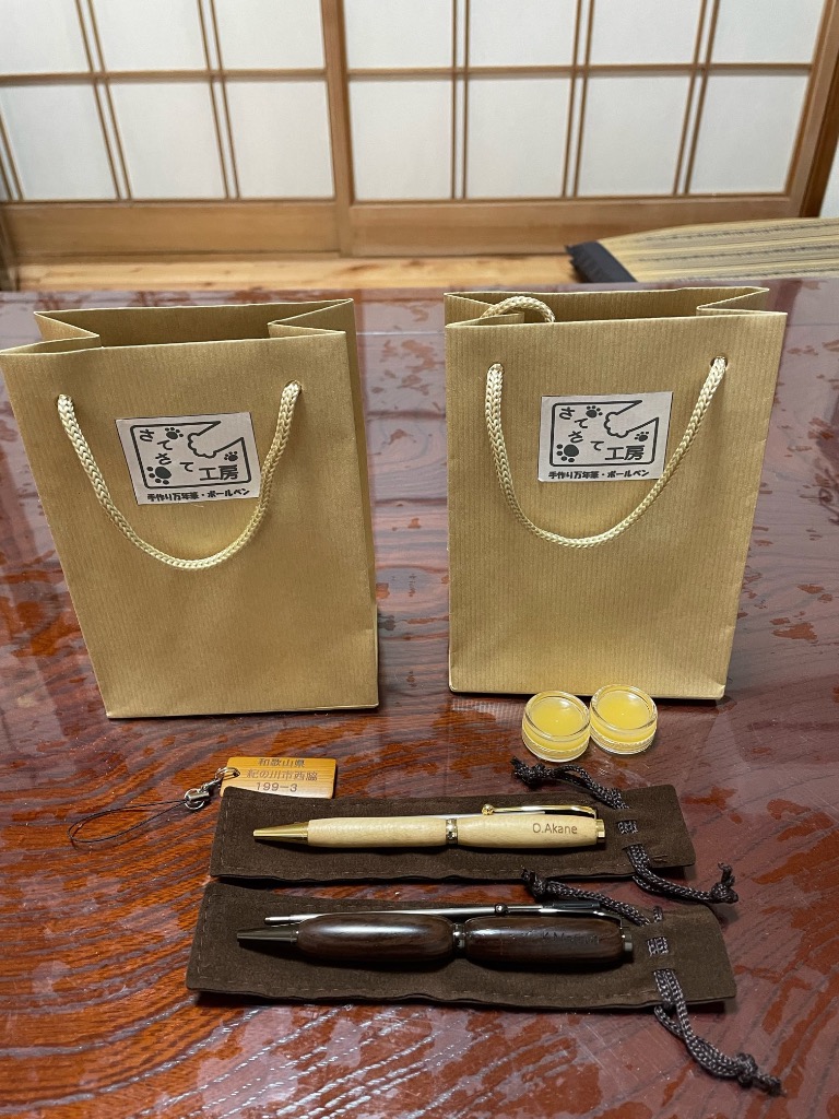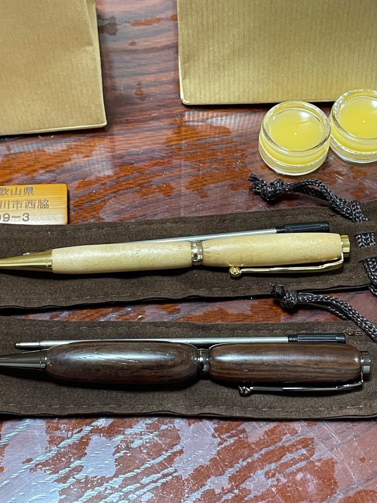今日のお客様は三重県から旅行中のカップルさんでした。遠回りの紀の川市の工房に立ち寄って頂き、嬉しいかぎりです。 モンゾと銀杏の木でボールペンを作って頂きました。